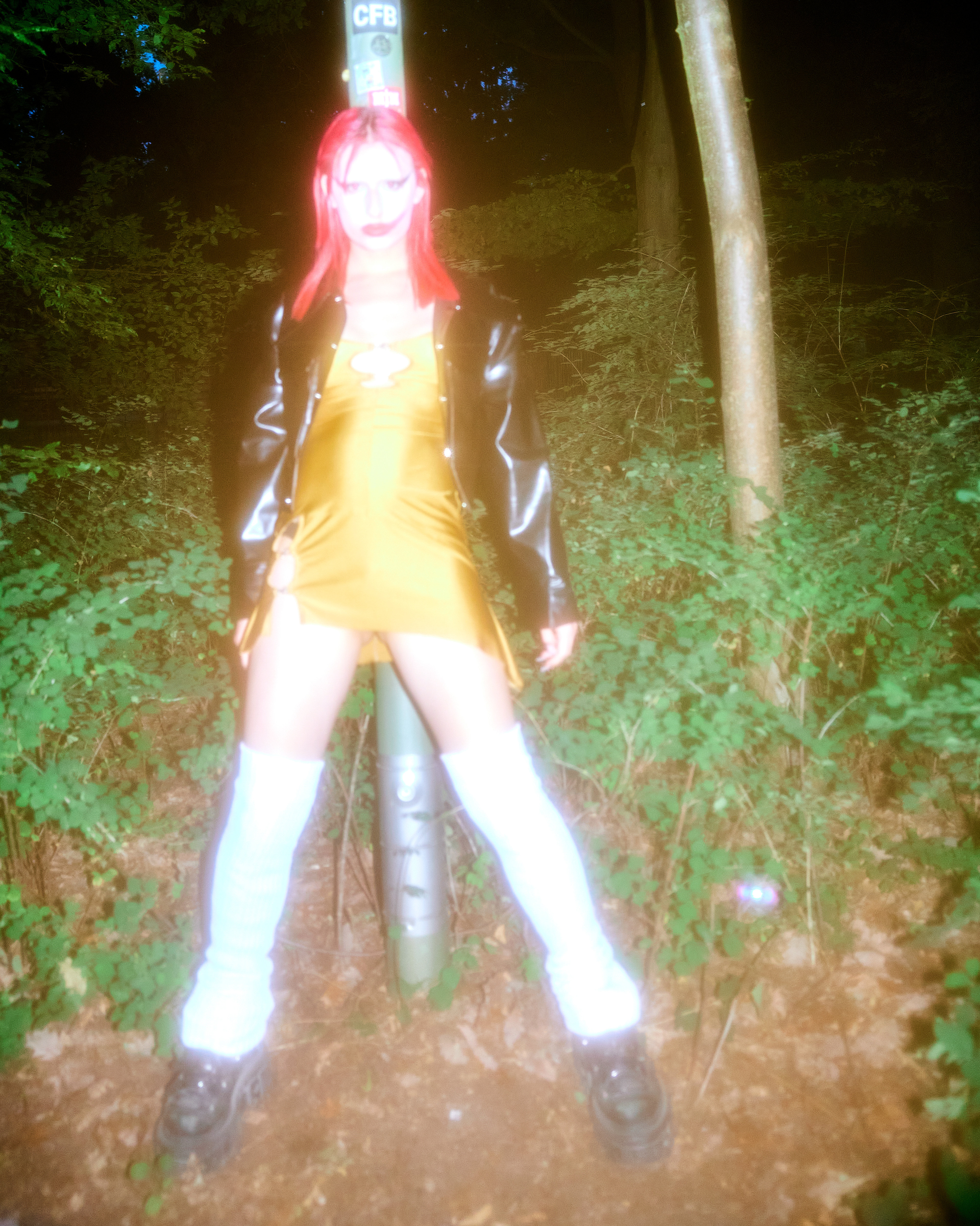 Gold dress, Leather Jacket, and Black Mesh Top by Still Apparel